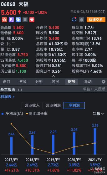 天福(06868)的净利润增长比较平滑,4年平均增长率10%,营收曲线和营业利润曲线也比较吻合。