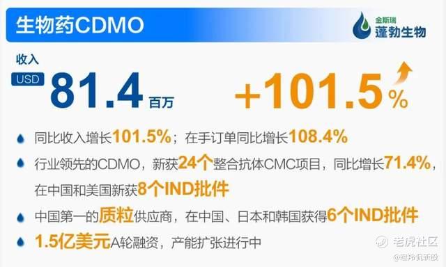 2、金斯瑞生物:公司最新披露了2021年业绩报告,生物制剂开发服务(大分子+CGT疗法)的收入约为0.814亿美元,同比2020年的0.404亿美元增长了101.5%,实现翻倍式增长。同时,毛利率和盈利数据层面有优化,毛利率从2020年的24.5%提升至2021年的31.4%,净亏损从2020年的750万美元减少至2021年的450万美元。