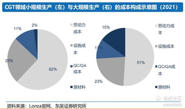 从生产角度分析,当小规模生产时,厂商投入的人力、设施成本占据大头;当转为GMP大规模生产时,这两块成本将被摊薄,原材料、耗材等成本快速提升。