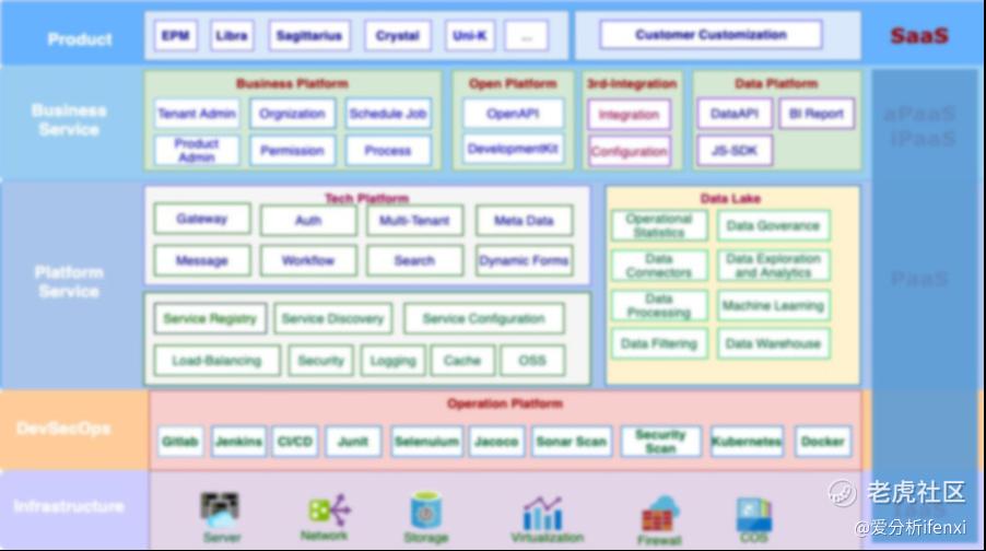 首先,肯耐珂萨的技术底座是一个强大的技术中台架构,包含四个层次。首先是基础的PaaS服务;其次,是在基础PaaS服务之上的数据服务;再次,具体应用支撑方面,中台提供了一些通用的业务型服务,比如通过流程引擎、规则引擎等;最后是业务服务,通过开放网关和内部网关接口串联不同的产品,同时也开放给客户。