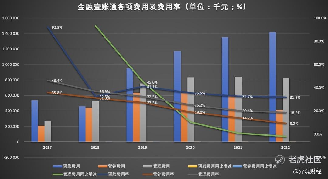 2022年,金融壹账通营销费用和行政管理费用均有不同程度的削减,其中营销费用大幅削减,该项费用同比减少30.1%至4.11亿元,营销费用率从2021年的14.2%,下降至2022年的9.2%;行政管理费用同比减少2%至8.25亿元,管理费用率从2021年的20.4%,下降至2022年18.5%;作为一家金融科技公司,研发费用需要长期稳定的投入,金融壹账通在研发方面的投入也在“克制”,2022年研发费用仅同比增长4.8%,研发费用率从2021年的32.7%,降至2022年的31.8%。