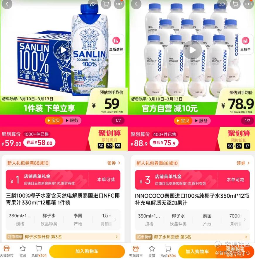 而除了if之外,在天猫超市里,泰国三麟100%椰子水,330毫升12瓶,券后价58元,月销超过1万件。同时,天猫超市里,同样泰国进口的INNOCOCO椰子水,350毫升12瓶,售价75.9元,月销量超过7000件。