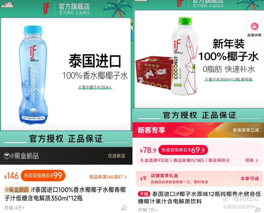 潘哥在淘宝上发现,销量最高的椰子水,并非来自椰树,而是泰国品牌if。天猫if旗舰店内,泰国进口的香水椰椰子水,350毫升12瓶,券后价99元,月销超过4万件,是天猫果蔬汁新品榜冠军。而在天猫超市里,if青椰椰子水,同样350毫升12瓶,券后价75.9元,月销量超过3万件。