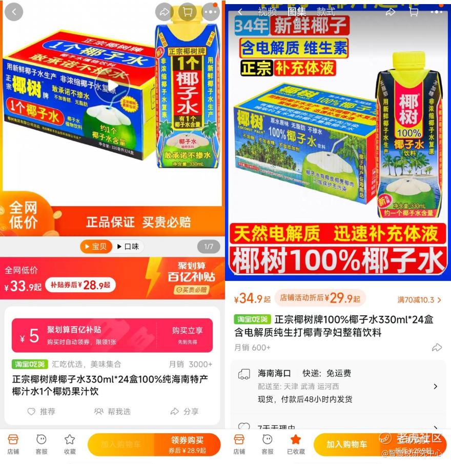 同时,在厚椰乳方面,天猫超市中,1升装的菲诺厚椰乳,券后价15.8元,月销量超过1万件;淘宝椰树牌椰汁超市中,同样1升装的椰树厚椰乳,售价18.9元,月销量仅为100多件。
