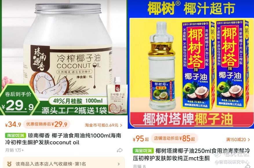 其中,淘宝琼南椰香店铺内,1000毫升的椰子油,售价29.9元,月销量超过1万件;淘宝椰树牌椰汁超市中,250毫升的椰树塔牌椰子油,折后价85元,月销量仅为8件。