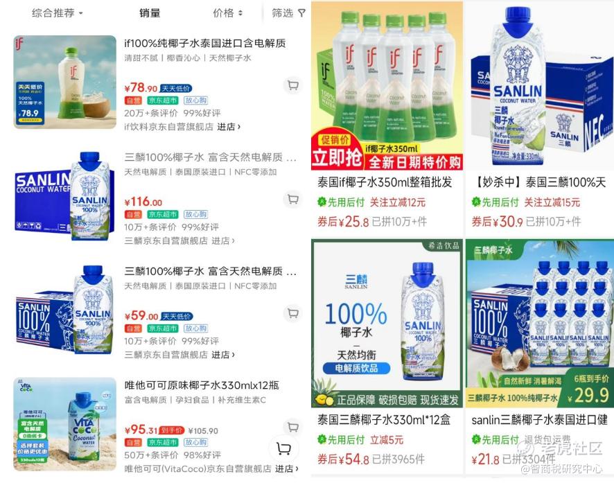 不仅如此,在京东、拼多多等平台上,椰树椰子水同样毫无优势。潘哥发现,京东上销量最高的椰子水,依次为if、三麟、唯他可可;而在拼多多上,if、三麟这两个泰国品牌,也都获得了“10万+”的销量。