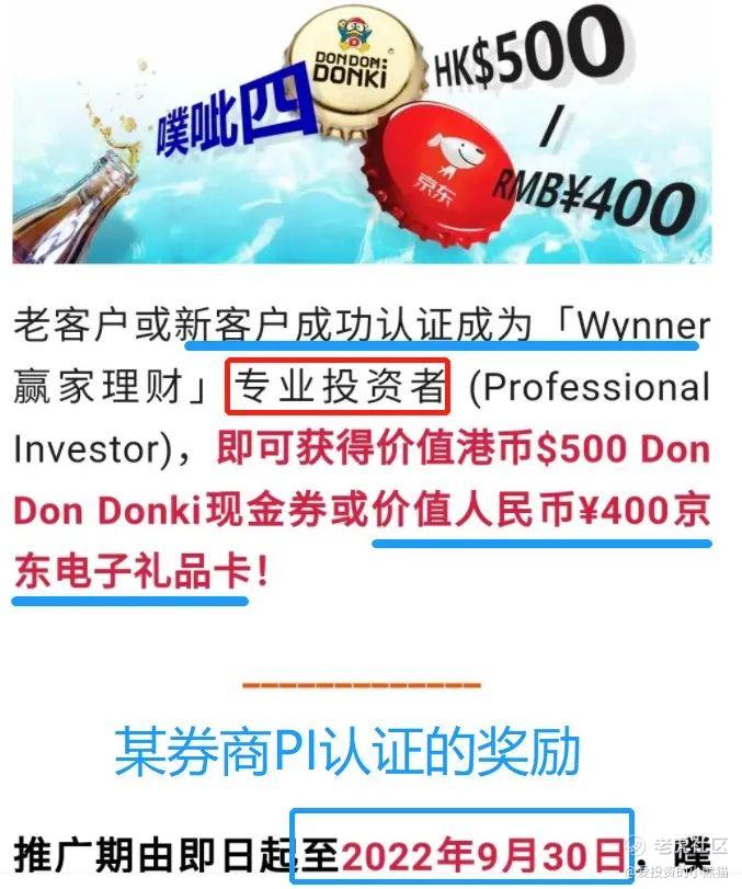 10.比如华泰香港的33倍孖展我们还在抱着手机盯着十二点整抢额度时通过PI认证的客户要额度只需提前打一声招呼即可。 11.可能有些券商pi认证通过的会有返现京东卡的活动。比如以前这个:老客户或新客户成功认证成为「Wynner赢家理财」专业投资者 (Professional Investor),即可获得价值港币$500 Don Don Donki现金券或价值人民币¥400京东电子礼品卡!