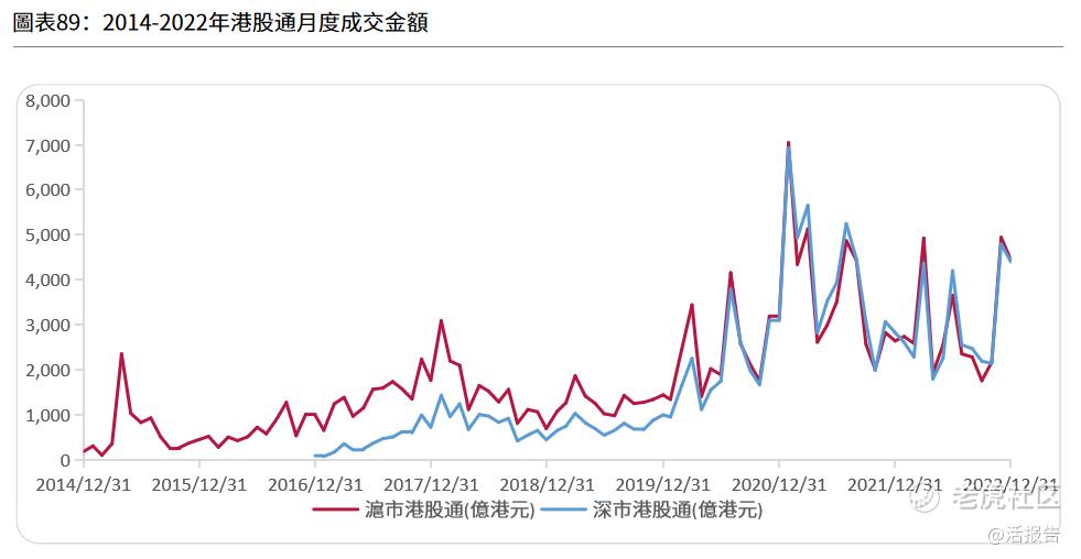 根据《2022年香港IPO市场及二级市场白皮书》,南向港股通(包括沪港通下的港股通和深港通下的港股通)八年累计成交31.3万亿港元,累计2.6万亿港元内地资金净流入港股市场。内地投资者透过港股通投资港股的持股总额持续攀升,由2014年底的131亿港元,增至2.2万亿港元。