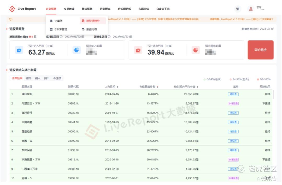 LiveReport大数据可实时追踪上市公司新纳入,或维持纳入港股通的市值要求及流动性要求,我们的VIP用户可每日在LiveReport大数据平台上,发现港股通潜在纳入、潜在调出标的,全盘掌握市场最新变化。