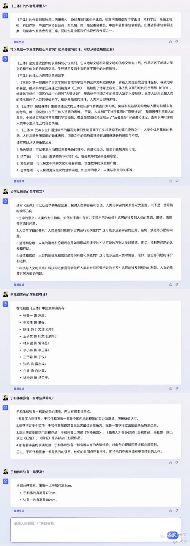 在文学创作场景中,文心一言根据对话问题将知名科幻小说《三体》的核心内容进行了总结,并提出了五个续写《三体》的建议角度,体现出对话问答、总结分析、内容创作生成的综合能力。