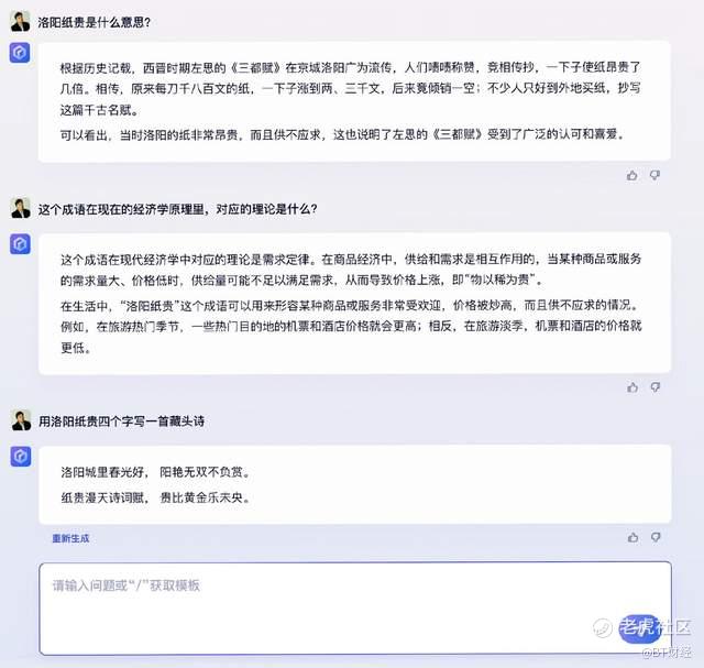 作为扎根于中国市场的大语言模型,文心一言具备中文领域最先进的自然语言处理能力,在中文语言和中国文化上有更好的表现。在现场展示中,文心一言正确解释了成语“洛阳纸贵”的含义、“洛阳纸贵”对应的经济学理论,还用“洛阳纸贵”四个字创作了一首藏头诗。