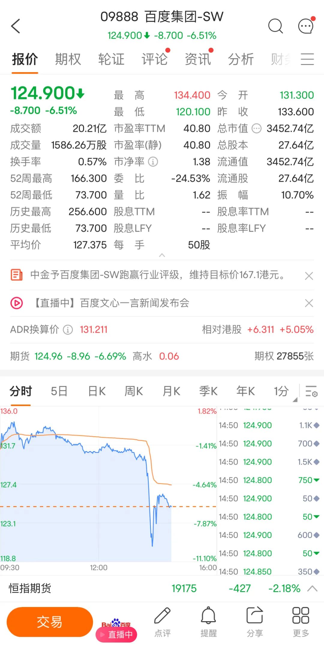 百度步谷歌后尘:文心一言发布,股价最高跌去近10%|甲子光年