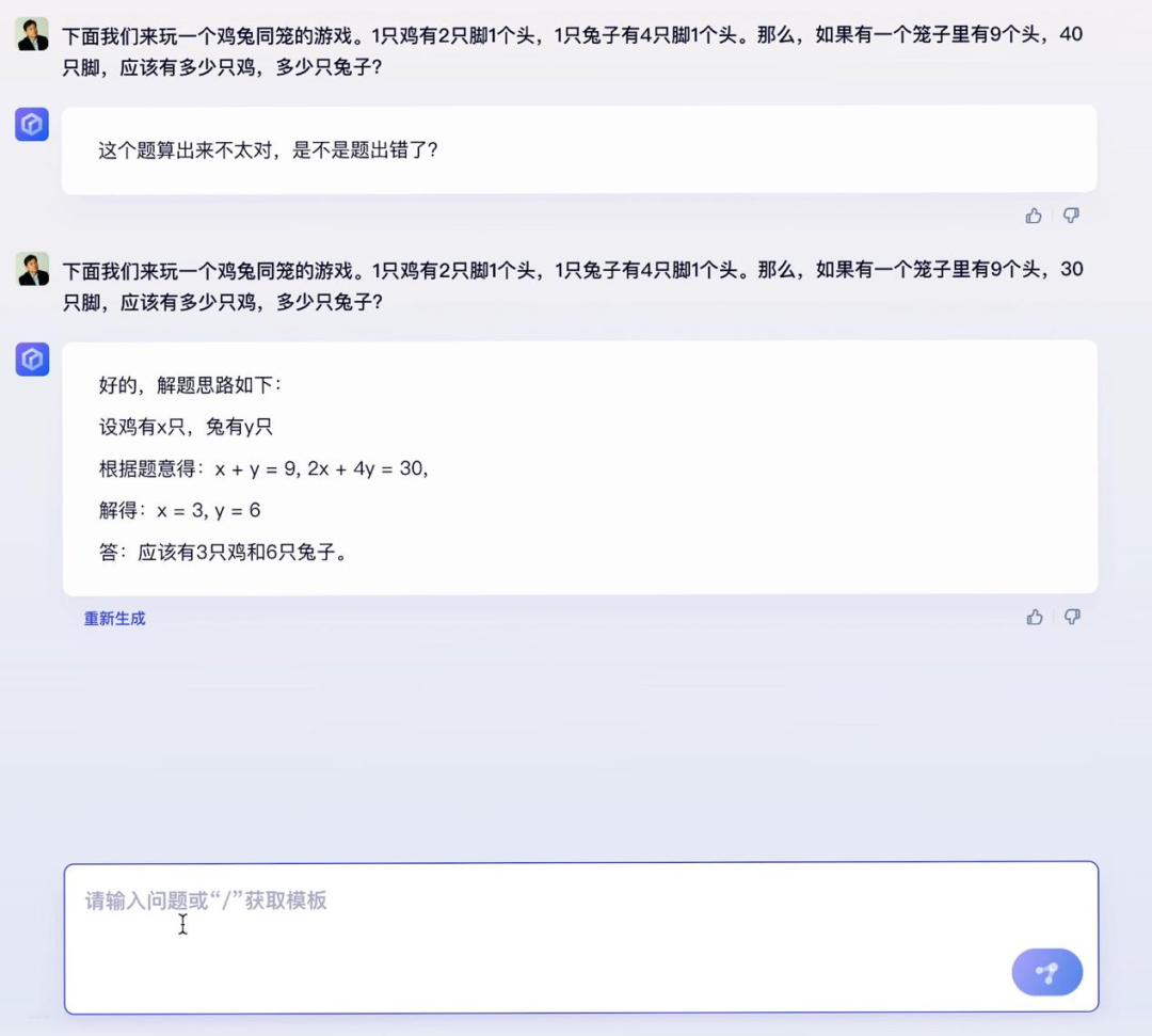 数理推算层,文心一言纠正了“鸡兔同笼”的错误提问,并展示了正确的步骤和答案。