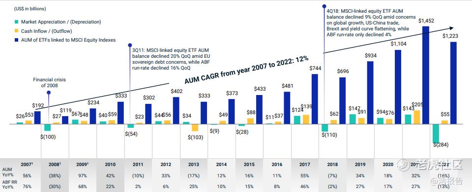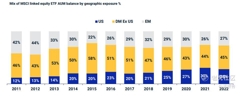其次,从产品角度看,MSCI在新兴市场宽基指数方面占据了主导地位,为了把握新兴市场优秀公司的投资机会,大量资金关注其新兴市场指数的纳入与剔除。截至2022年底,与MSCI股票指数挂钩的ETF的AUM(资产管理规模)已超过1.2万亿美元,其中美国市场占28%、美国以外的发达市场占45%,包括A股在内的新兴市场占27%。被纳入MSCI中国指数,也就意味着它受到了跟踪MSCI新兴市场指数的超过3千亿美元被动资金(ETF)的关注,而这还不包括其他主动型的国际资金。