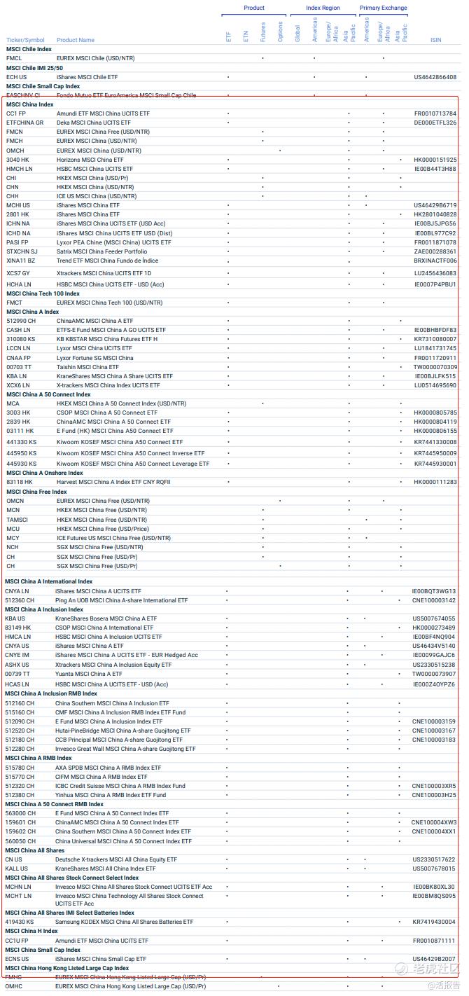根据MSCI的数据,目前光是追踪MSCI中国指数(MSCI China Index)的交易所交易产品(包括结构性产品和ETF等)就达到了19只,与中国市场相关的指数产品上百只。Wind数据显示,目前MSCI中国指数(美元)成分股共有716只,挂钩了包括安硕MSCI中国ETF在内的5支跟踪基金超过150亿美元的资金。