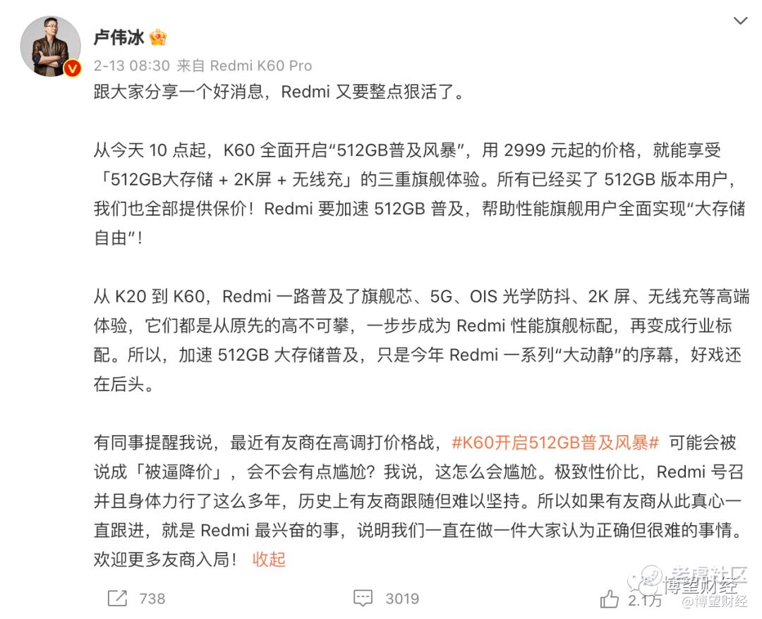 这也给市面上主打高性价比的品牌带来巨大的竞争压力。2023年2月13日,也就是一加 Ace 2首销当天,Redmi品牌总经理卢伟冰发文称,K60开启“512GB普及风暴”,Redmi K60 512GB版降价300元,售价2999元。值得注意的是,Redmi K60是2022年12月才问世的新机。
