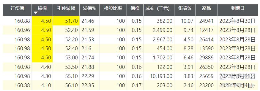 行使价位于153.7-162.8,到期日3-6个月的百度集团认购证一共有8只,实际杠杆为4.1-4.5倍;较高杠杆的有26414及23200。