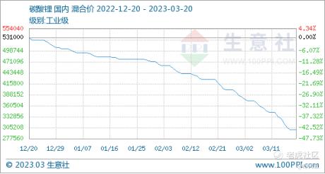 2023年开局,锂资源供应迎来巨大反转。据生意社最新数据,3月16日,部分锂电材料报价继续下跌,其中电池级碳酸锂基准价为34.7万元/吨,与本月初相比,下降了14.95%,创下了近一年以来的价格新低。