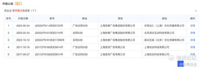 爱企查显示,悦普集团有7条开庭信息,5条为广告合同纠纷,2023年年内开庭的便有两起案件,不过该信息并未在《招股书》中披露。