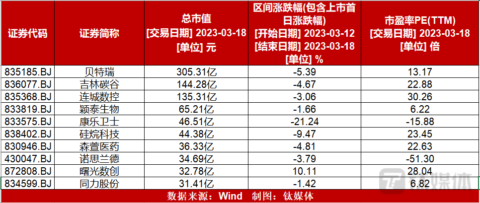 整体来看,上周北交所个股持续走弱。超八成个股下跌。涨幅前十的个股分别为:曙光数创涨幅10.11%,总市值32.78亿元;德源药业涨幅9.93%,总市值24.69亿元;同惠电子涨幅7.52%,总市值17.73亿元;禾昌聚合涨幅3.03%,总市值11.71亿元;殷图网联涨幅2.61%,总市值3.35亿元;利通科技涨幅2.55%;总市值8.07亿元;常辅股份涨幅2.16%,总市值4.15亿元;数字人涨幅1.84%,总市值8.81亿元;科达自控涨幅1.40%,总市值9.42亿元;鑫汇科涨幅1.38%,总市值4.76亿元。