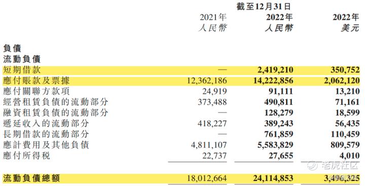 2022财年,小鹏汽车的短期借款为24.2亿元,2021年报中并没有短期借款;流动负债总额为241.1亿元,同比增加33.9%。