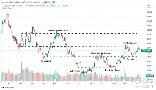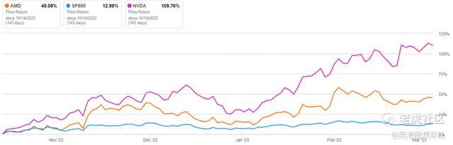 截至撰写本文时,与标普500指数的12.9%和NVDA的109.76%相比,AMD仅从2022年10月低点反弹了45.08%。这可能是由于人们对ChatGPT的热情,该技术是在NVDA的A100 GPU上训练的,尤其得益于后者在GPU销售前景乐观的背景下进行财务恢复。
