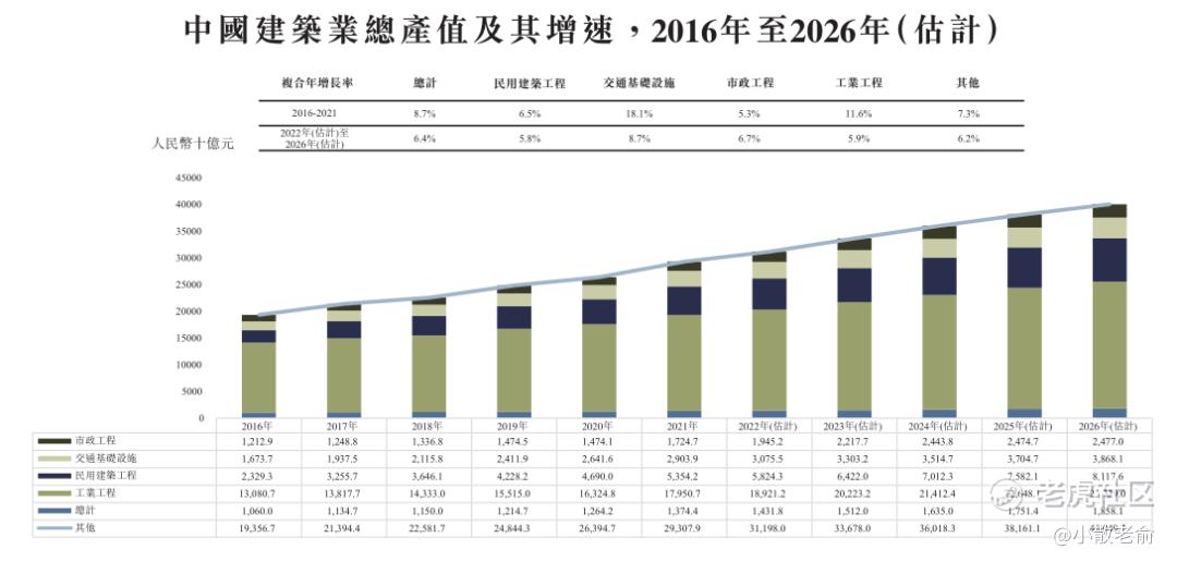 在中国,以产值计算,总承包商建设的项目占建筑行业的大部分市场份额。于2016年,总承建商占建筑市场份额的90.8%,该主导市场占用率于2021年进一步增至91.8%。预计建筑行业的产值将会继续保持适度增长。预期总承包商将继续主导中国建筑行业,其产值预计将于2026年达到人民币370,611亿元,2022年至2026年的复合年增长率为6.6%。