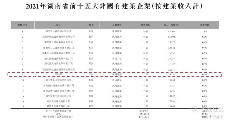 公司是湖南省一家有着逾40年经营历史的知名总承包建筑集团。根据弗若斯特沙利文报告,就2021年的建筑收入而言,于2021年,在湖南省3,438家非国有建筑企业中的十大非国有建筑企业之一,市场份额约为0.2%;及就2021年的建筑收入而言,于2021年,在湖南省302家具有总承包一级资质的非国有建筑企业中排名第五的非国有建筑企业,市场份额约为0.4%。于2021年,湖南省在中国建筑行业的市场份额约为4.5%。