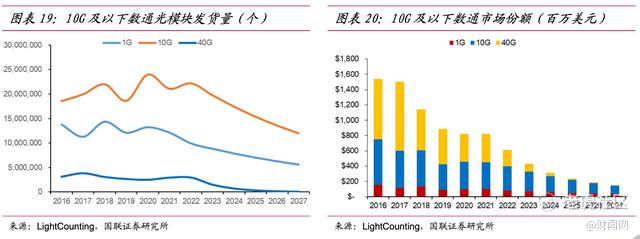 从 LightCounting 的预测数据看,1G、10G、40G 数通光模块发货量从 2023 年开始下降,市场规模从 2022 年的 6.14 亿美元下降到 2027 年的 1.50 亿美元。按照 18%的占比,对应的光芯片市场规模从 2022年的 1.11 亿美元下降到 2027 年的 0.27 亿美元。