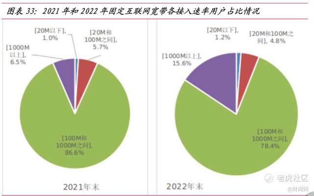 截至 2022 年底,三家基础电信企业的固定互联网宽带接入用户总数达 5.9 亿户,全年净增 5386 万户。其中,100Mbps 及以上接入速率的用户为 5.54 亿户,全年净增 5513 万户,占总用户数的 93.9%,占比较上年末提高 0.8 个百分点;1000Mbps及以上接入速率的用户为 9175 万户,全年净增 5716 万户,占总用户数的 15.6%,占比较上年末提高 9.1 个百分点。