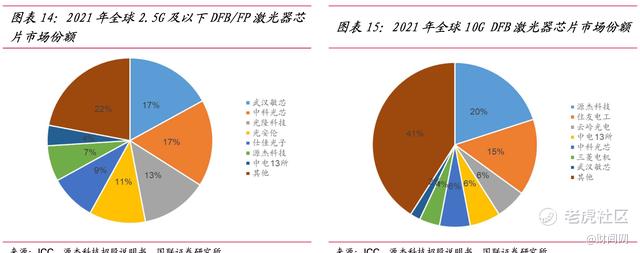 根据 ICC 预测,2021 年 2.5G 及以下国产光芯片占全球比重超过 90%,10G 光芯片方面国产光芯片占全球比重约 60%,但不同频段光芯片的国产化情况存在差异,部分 10G 光芯片产品性能要求较高、难度较大,如 10G VCSEL EML 激光器芯片等,国产化率不到 40%。