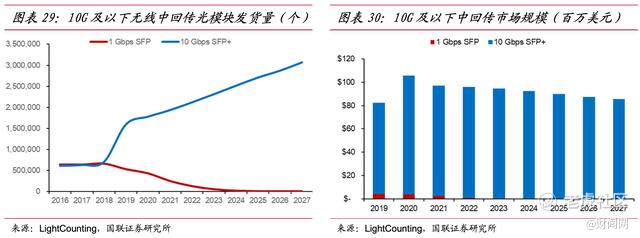 随着 5G 用户渗透率提升和 5G 应用的不断丰富,5G 流量需求会持续增长,这会带来无线中回传网络扩容需求。根据 LightCounting 的预测数据,5G 中回传 10G 光模块发货量从 2022 年 210 万片增长到 2027 年的 306 万片,5 年 CAGR 为 7.68%。持续增长的需求让 10G 及以下光模块市场基本稳定 0.9 亿美元,对应的光芯片市场约0.181 亿美元。