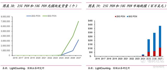 25G PON 和 50G PON 作为下一代产品,在 2024 年才会小规模部署,主要的部署期在 2025 年之后,但是 25G 及以上 PON 光模块的市场规模会在 2025 年突破2 亿美元,对应 0.4 亿美元光芯片市场,并在 2026-2027 年保持 30%以上的同比增长。