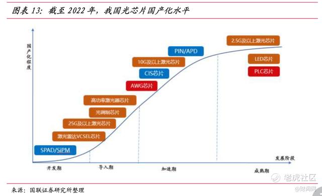 从国产化进展来看,当前我国高功率激光器芯片,部分高速率激光器芯片已处于国产化加速突破阶段,而光探测芯片、25G 以上高速率光芯片仍处于进口替代早期阶段。国产光芯片在高端产品领域同国外厂商还有较大差距。