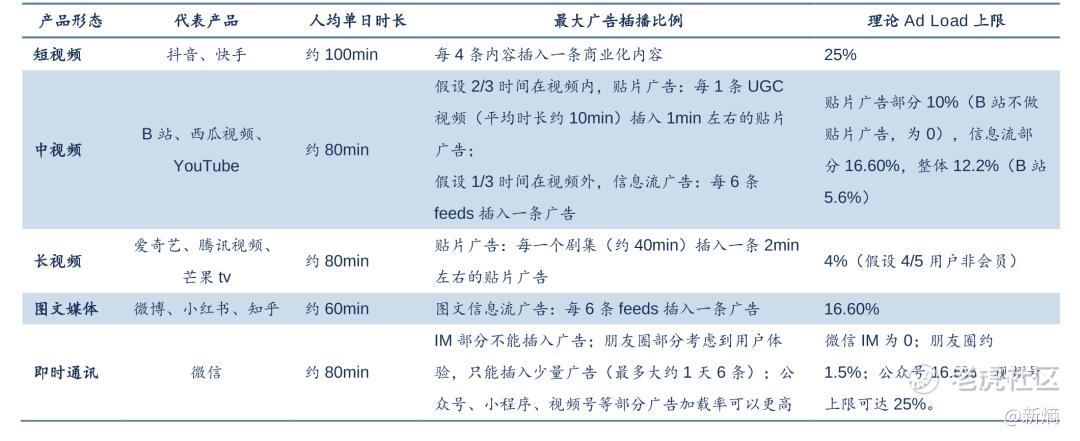 先看广告加载率,按照不同的产品形态,以微博为代表的图文短内容,理论上Ad Load上限在16.6%,短视频平台则保持在25%。同样的流量前提下,微博的广告空间天花板天然低于短视频。
