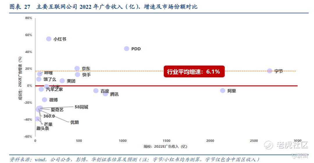 根据华创证券研究报告显示,2022年Top20的互联网公司广告收入成绩单中:从成长性看,小红书、拼多多、京东、字节、快手、B站在过去一年仍然实现了超越市场平均的增速,美团增速与行业基本持平。