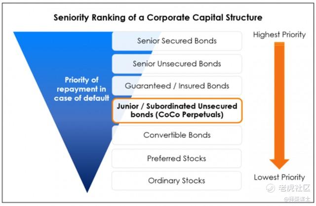•按照资本结构优先级排序,CoCos和AT1的优先级低于所有其他债务,因此仅高于普通股、优先股和可转换债务。考虑到CoCos在资本结构中排序较低,其支付的票息高于传统债券,收益率也更高;此外,由于CoCos有看涨期权,收益率也会较高,以弥补发行人赎回债券的风险。