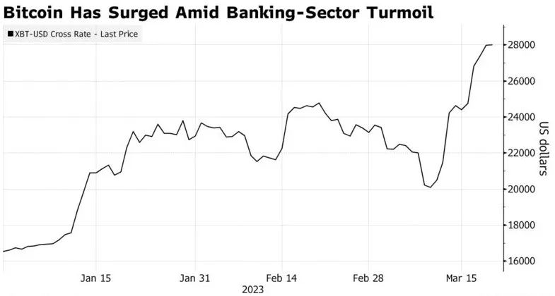 自3月8日硅谷银行(SIVB.US)首次出现问题迹象以来,比特币这一最大数字货币已上涨约25%。此后,硅谷银行倒闭,并引发了其他银行的动荡。自本月初以来,这种数字货币已经上涨了20%以上,交易价格在2.8万美元左右,为去年6月以来的最高水平,当时数字资产领域发生了一系列崩盘事件,震动了整个行业,并对价格造成了压力。上一次比特币交易价格为3万美元,也是在去年6月。