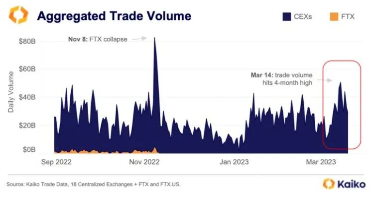 由Dessislava Aubert和Clara Medalie领导的Kaiko团队写道:“比特币正在飞速发展。在过去一周,市场情绪发生了戏剧性的逆转,持续的银行危机加强了加密货币在投资者中的新颖故事。”该公司的研究表明,加密货币交易量达到了自去年年底FTX崩溃以来的最高水平。