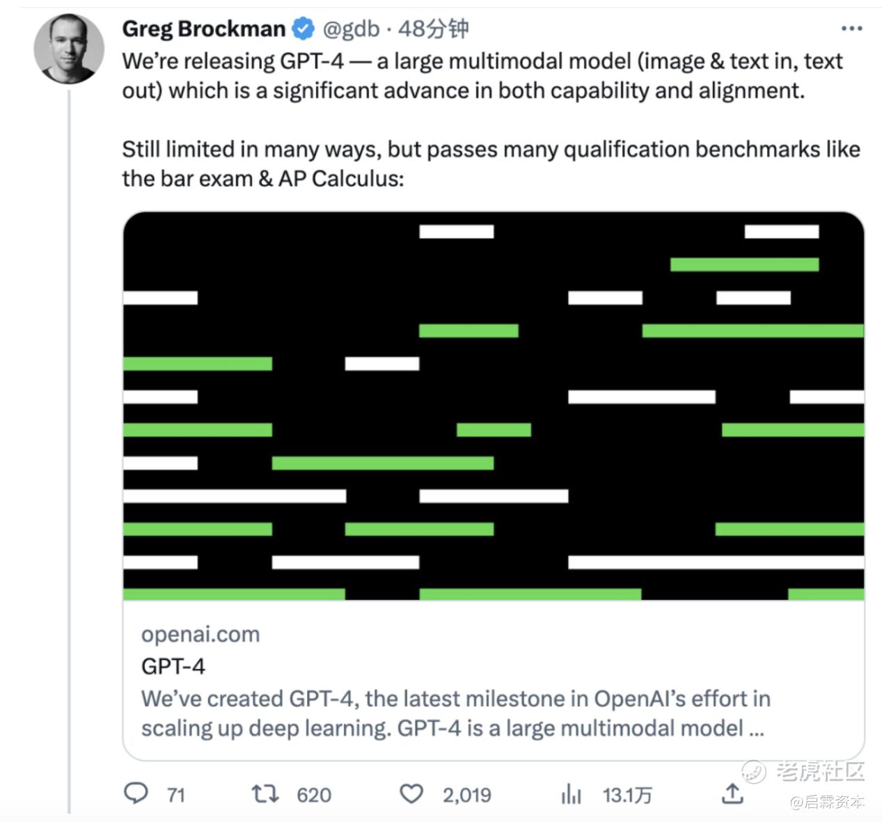 近日,OpenAI宣布推出大型的多模态模型GPT-4,称它可以接收图像和文本输入,输出文本,“比以往任何更具创造性和协作性”,并且“由于它有更广泛的常识和解决问题的能力,可以更准确地解决难题。”OpenAI表示,GPT-4能同时解析文本和图像,所以能解读更复杂的输入内容。