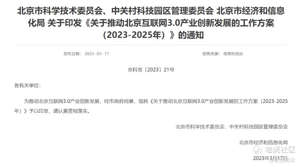 3月17日,为推动北京互联网3.0产业创新发展,经市政府同意,北京市科学技术委员会、中关村科技园区管理委员会北京市经济和信息化局发布《关于推动北京互联网3.0产业创新发展的工作方案(2023-2025年)》的通知。