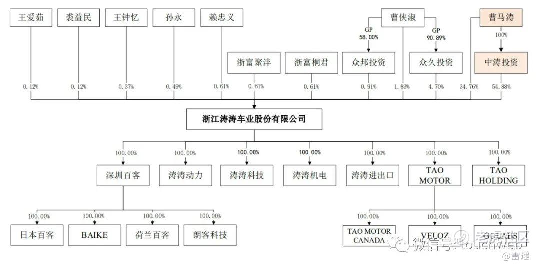 涛涛车业系由曹马涛与涛涛集团发起设立的股份有限公司,控股股东为中涛投资,直接持有公司4500万股;实际控制人为曹马涛。