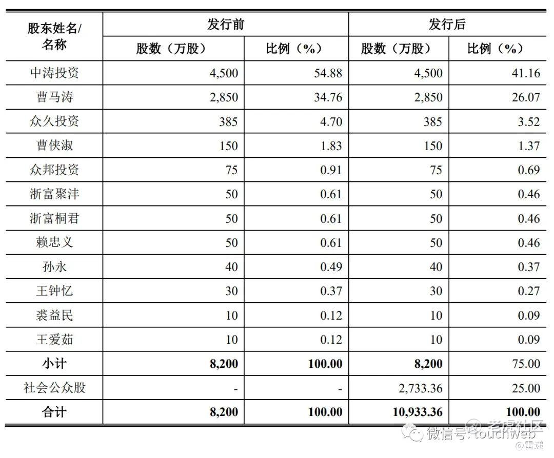 IPO后,中涛投资持股为41.16%,曹马涛持股为26.07%,众久投资持股为3.52%,曹侠淑持股为1.37%,众邦投资持股为0.69%;