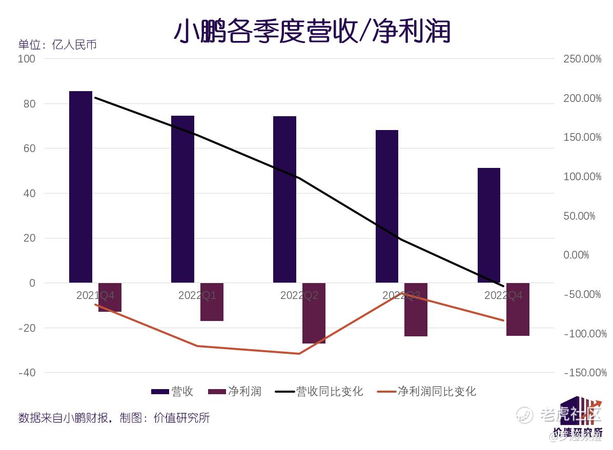 营收骤降,利润自然不会太好看。四季度,小鹏净亏损23.61亿元,同比放大了83.45%;2022财年全年净亏损则录得91.4亿元,同比放大了88.01%。