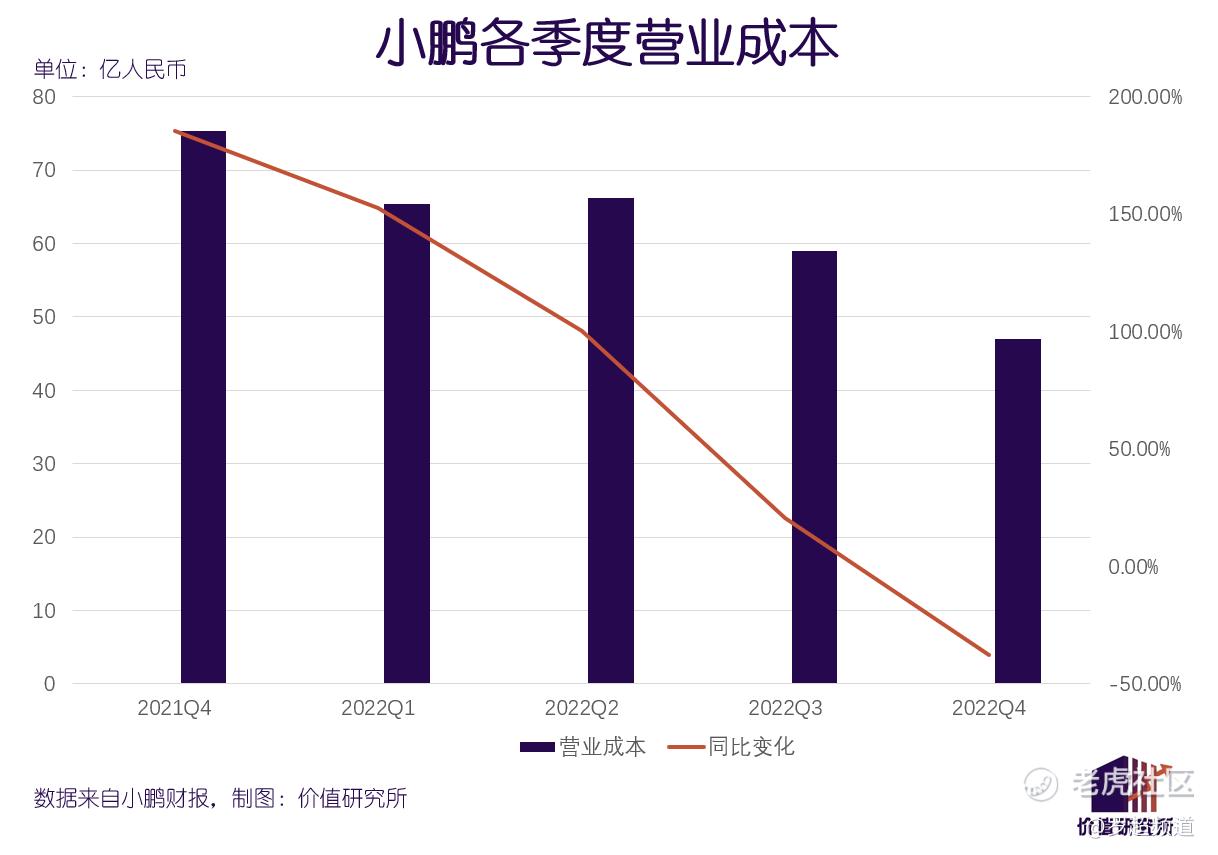 何小鹏重点提到的车型平台和智能生产基地投资,除了能提高产能,还有另一个重要目的:提高运行效率,压缩生产、经营成本。四季度,小鹏营业成本46.95亿元,同比减少37.67%,也远低于三季度的75.33亿元。从分项数据看,销售、管理费用都有所下降,只有研发费用仍在增加。