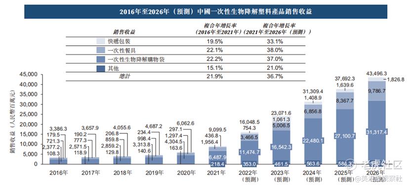 从行业层面看,生物降解塑料是一种能够在自然环境中被微生物分解的塑料,具有环保、可再生、节能等优点,是替代传统塑料的一种新型材料。随着国家对塑料污染的治理力度加大,以及消费者对绿色环保产品的需求增加,生物降解塑料市场呈现快速增长的趋势。根据弗若斯特沙利文报告,中国一次性生物降解塑料市场规模从2016年的人民币33.9亿元增长到2020年的人民币91.0亿元,复合年增长率达21.9%,预计到2026年将达到人民币435.0亿元,未来复合年增长率为36.7%,保持高速增长。