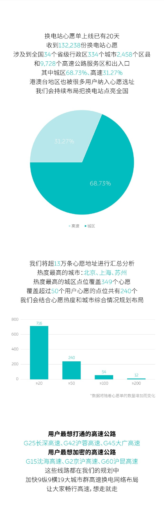 截止到 3 月 20 日,蔚来换电站已累计达到 1332 座,高速换电站351 座。这也是高速心愿单占比只有 31.7%的原因,大部分需要长途出行的用户,长跑的几条线路,大部分已经有换电站覆盖了。