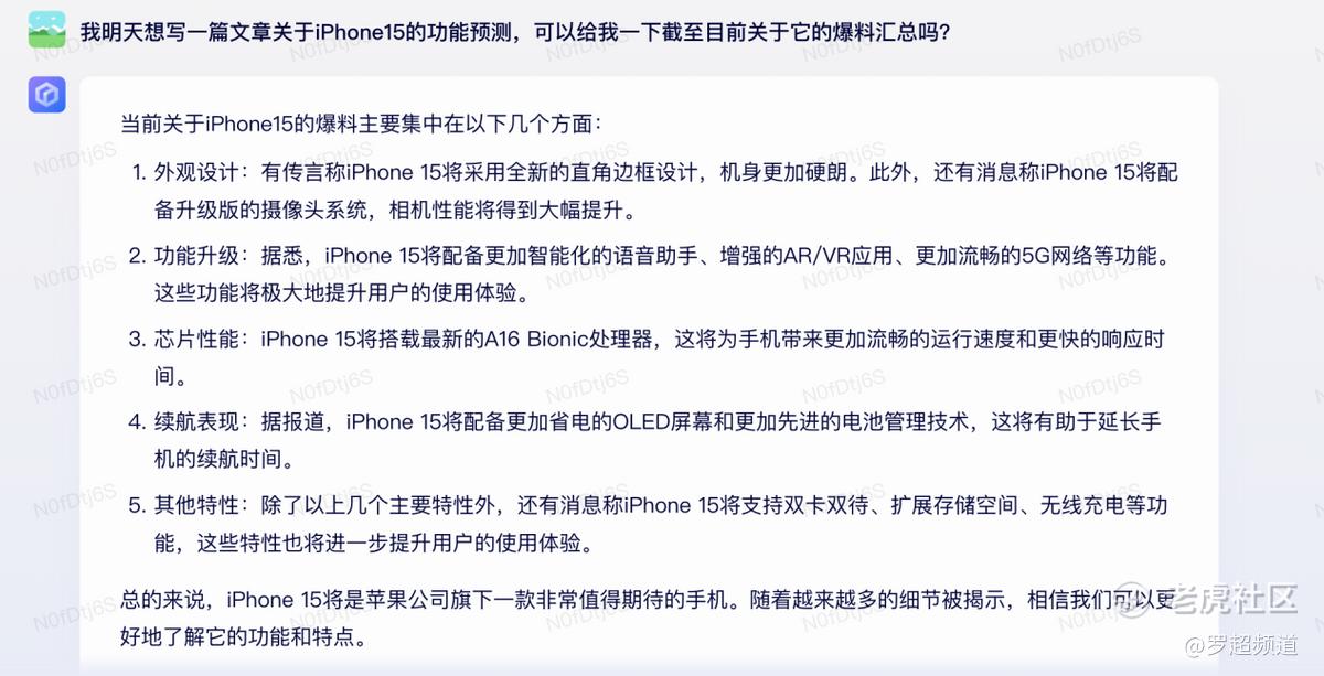 科技媒体每年都会围绕iPhone年度新品做很多爆料文,2023年关注iPhone 15,文心一言准确地给我收集了iPhone 15的爆料汇总,从外观到功能到芯片到续航一应俱全——日常科技媒体做新机爆料基本也是这么个套路。