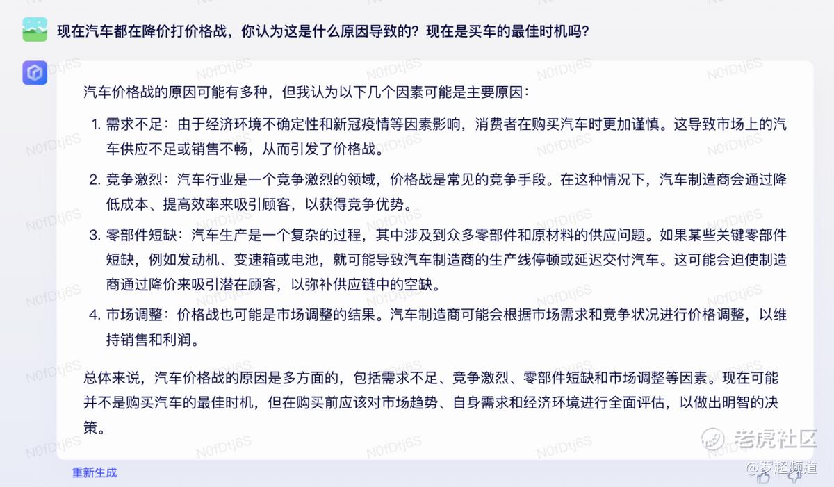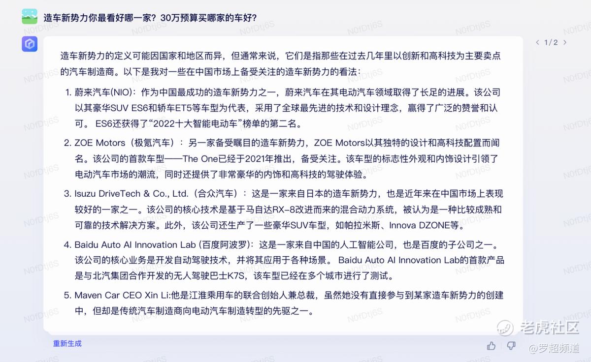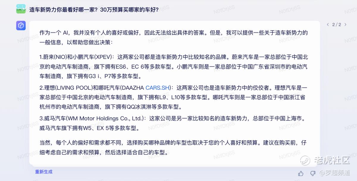 比如我问TA对造车新势力的看法: