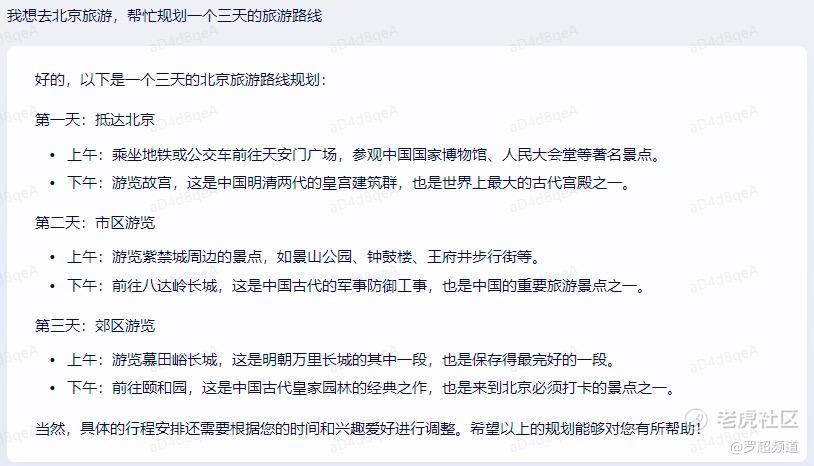 我们编辑要去北京参加某个发布会,文心一言也顺便推荐了他在北京旅游的路线: